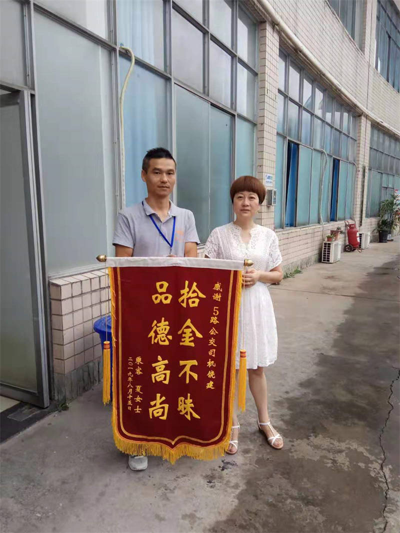 8月20日上午,市民夏女士冒著小雨來(lái)到公交總站,親手將一面寫有“拾金不昧品德高尚”的錦旗送到5路公交車司機(jī)饒建手上。送上錦旗時(shí),夏女士口中還在不停的念叨著:“公交司機(jī)師傅很棒,真的要感謝你喲!
