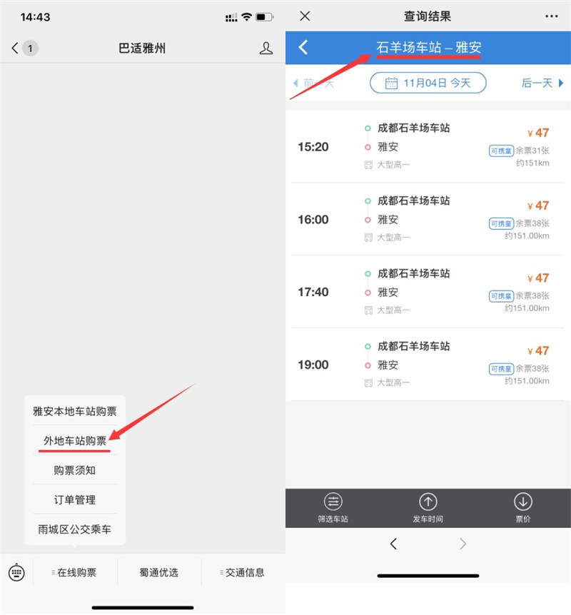 11月4日,蜀通公司線上購票平臺“巴適雅州”微信公眾號開通省內(nèi)外多地區(qū)汽車購票業(yè)務。