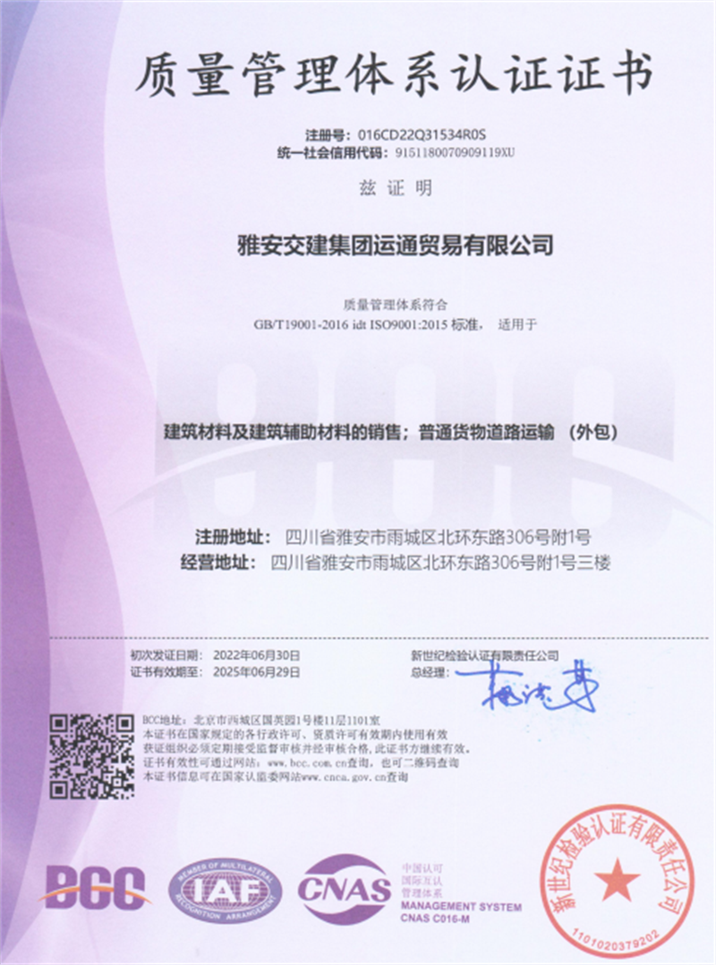 運(yùn)通公司將持續(xù)有效推進(jìn)質(zhì)量體系運(yùn)行的科學(xué)化、規(guī)范化,將質(zhì)量標(biāo)準(zhǔn)貫徹落實(shí)到每一項(xiàng)工作、每一個(gè)環(huán)節(jié)中,為公司持續(xù)穩(wěn)定健康發(fā)展提供重要保障。