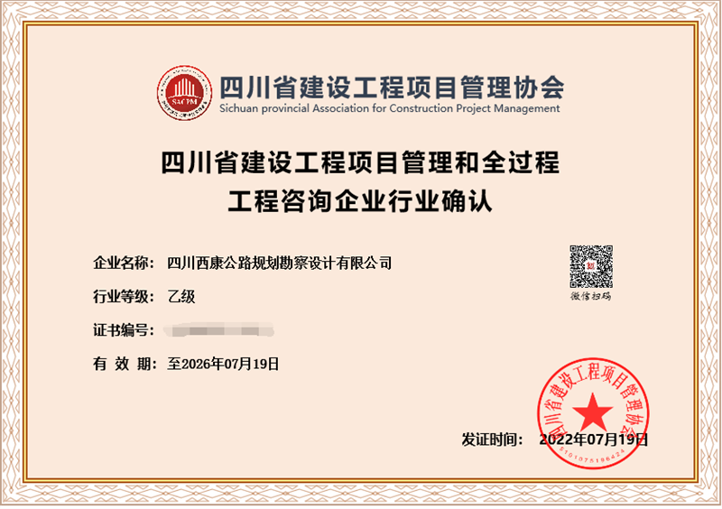 日前,經(jīng)四川省建設(shè)工程項(xiàng)目管理協(xié)會(huì)評(píng)審,交建集團(tuán)四川西康公路規(guī)劃勘察設(shè)計(jì)有限公司獲得“四川省建設(shè)工程項(xiàng)目管理和全過程工程咨詢企業(yè)行業(yè)乙級(jí)資格”確認(rèn),成為四川省內(nèi)為數(shù)不多獲得開展全過程項(xiàng)目管理和咨詢資質(zhì)企業(yè)之一。
