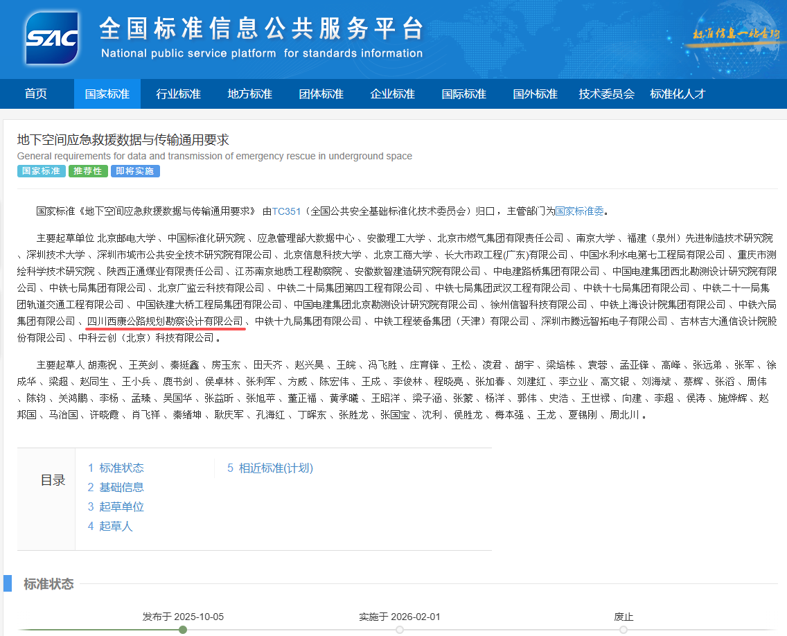 近日,由四川西康公路規(guī)劃勘察設計有限公司參與編制的推薦性國家標準GB/T 46338-2025《地下空間應急救援數(shù)據(jù)與傳輸通用要求》經(jīng)國家標準委批準正式發(fā)布,將于2026年2月1日起正式實施。
