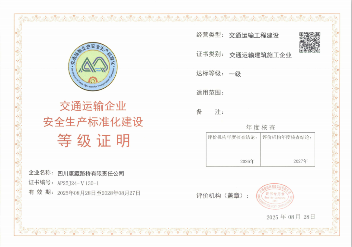 近日,經(jīng)交通運(yùn)輸部交通運(yùn)輸企業(yè)安全生產(chǎn)標(biāo)準(zhǔn)化評(píng)價(jià)機(jī)構(gòu)綜合評(píng)定,康藏路橋公司獲評(píng)安全標(biāo)準(zhǔn)化一級(jí)企業(yè)并取得證書,標(biāo)志其安全生產(chǎn)管理體系獲國家最高標(biāo)準(zhǔn)認(rèn)可。