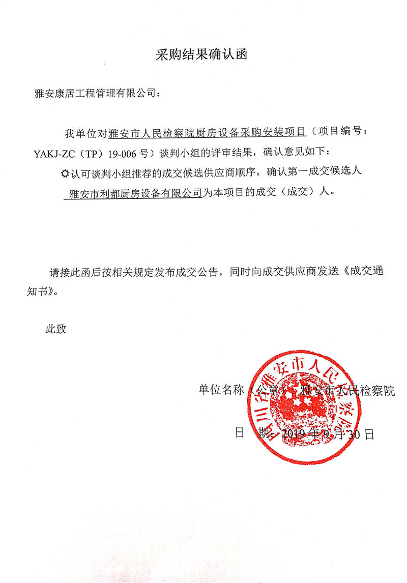 雅安市人民檢察院廚房設備采購安裝項目采購結果公示