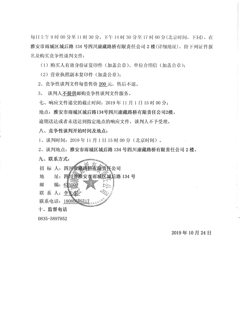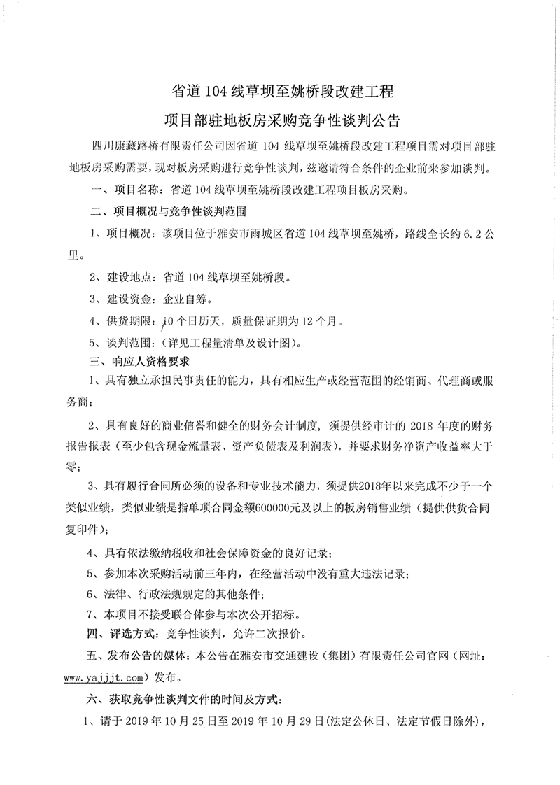 四川康藏路橋有限責(zé)任公司省道104線(xiàn)草壩至姚橋段改建工程項(xiàng)目部駐地板房采購(gòu)競(jìng)爭(zhēng)性談判公告