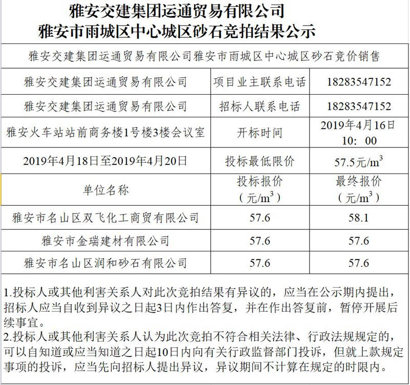 雅安交建集團(tuán)運(yùn)通貿(mào)易有限公司中心城區(qū)砂石競(jìng)拍結(jié)果公示