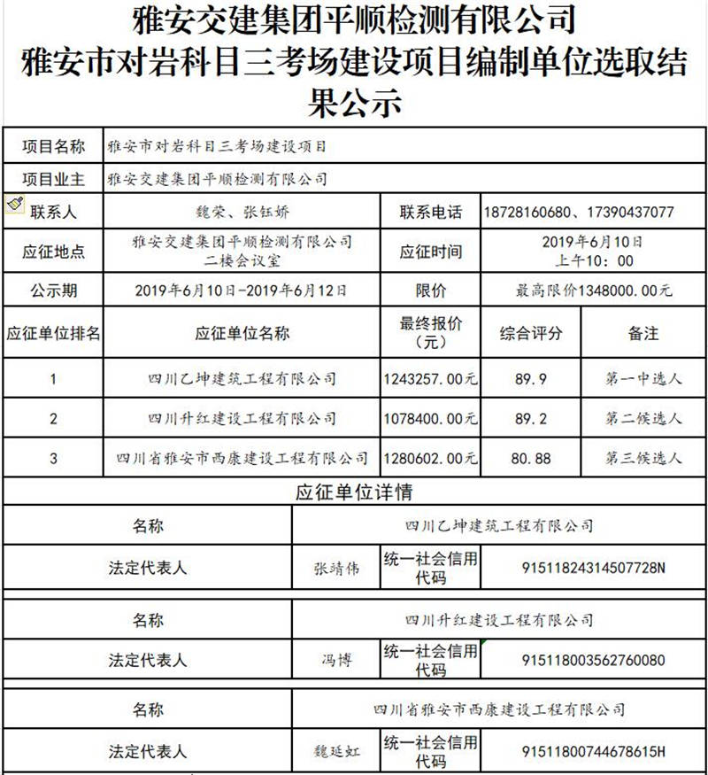 雅安交建集團平順檢測有限公司雅安市對巖科目三考場建設項目編制單位選取結(jié)果公示
