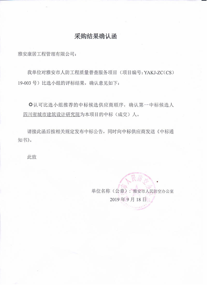 雅安市人民防空辦公室雅安市人防工程質(zhì)量普查服務(wù)項目評標(biāo)結(jié)果公示