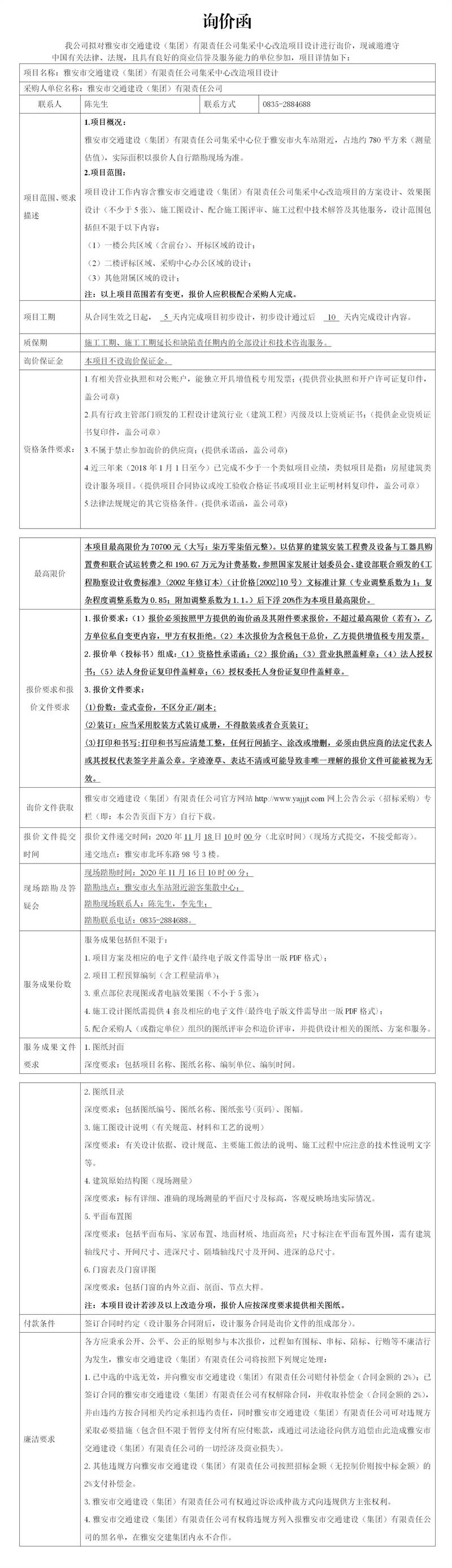 雅安市交通建設(shè)(集團(tuán))有限責(zé)任公司集采中心改造項(xiàng)目設(shè)計(jì)詢價(jià)公告