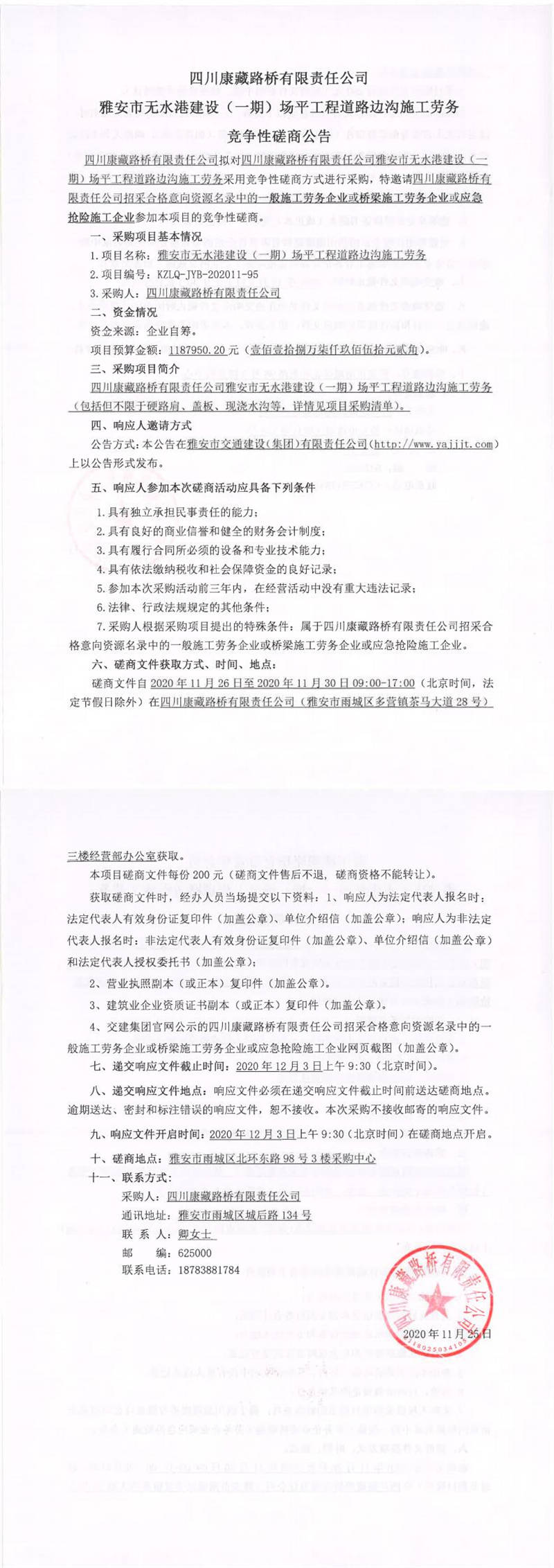 四川康藏路橋有限責任公司雅安市無水港建設(一期)場平工程道路邊溝施工勞務競爭性磋商公告