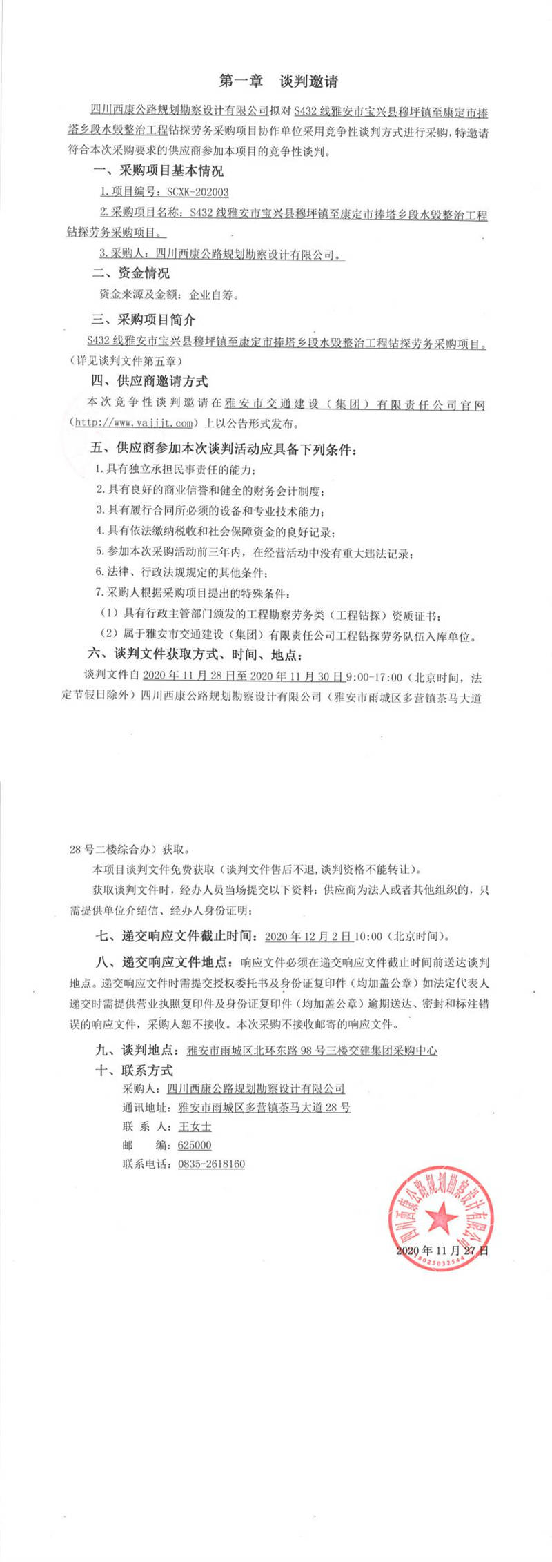 四川西康公路規(guī)劃勘察設(shè)計(jì)有限公司S432線雅安市寶興縣穆坪鎮(zhèn)至康定市捧塔鄉(xiāng)段水毀整治工程鉆探勞務(wù)采購(gòu)項(xiàng)目談判公告