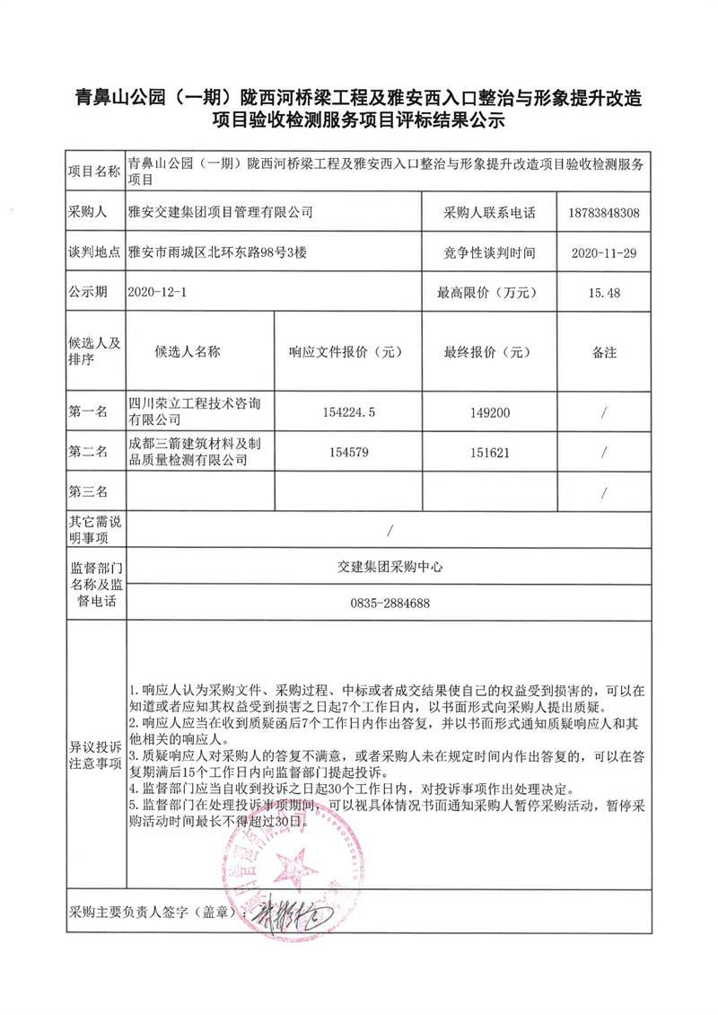 雅安交建集團項目管理有限公司青鼻山公園(一期)隴西河橋梁工程及雅安西入口整治與形象提升改造項目驗收檢測服務(wù)項目評標結(jié)果公示