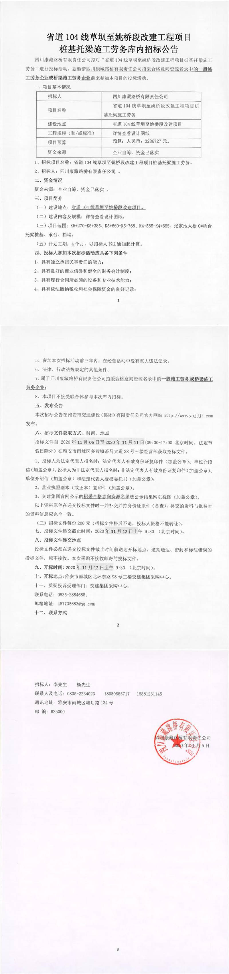 四川康藏路橋有限責任公司省道104線草壩至姚橋段改建工程項目樁基托梁施工勞務庫內(nèi)招標公告