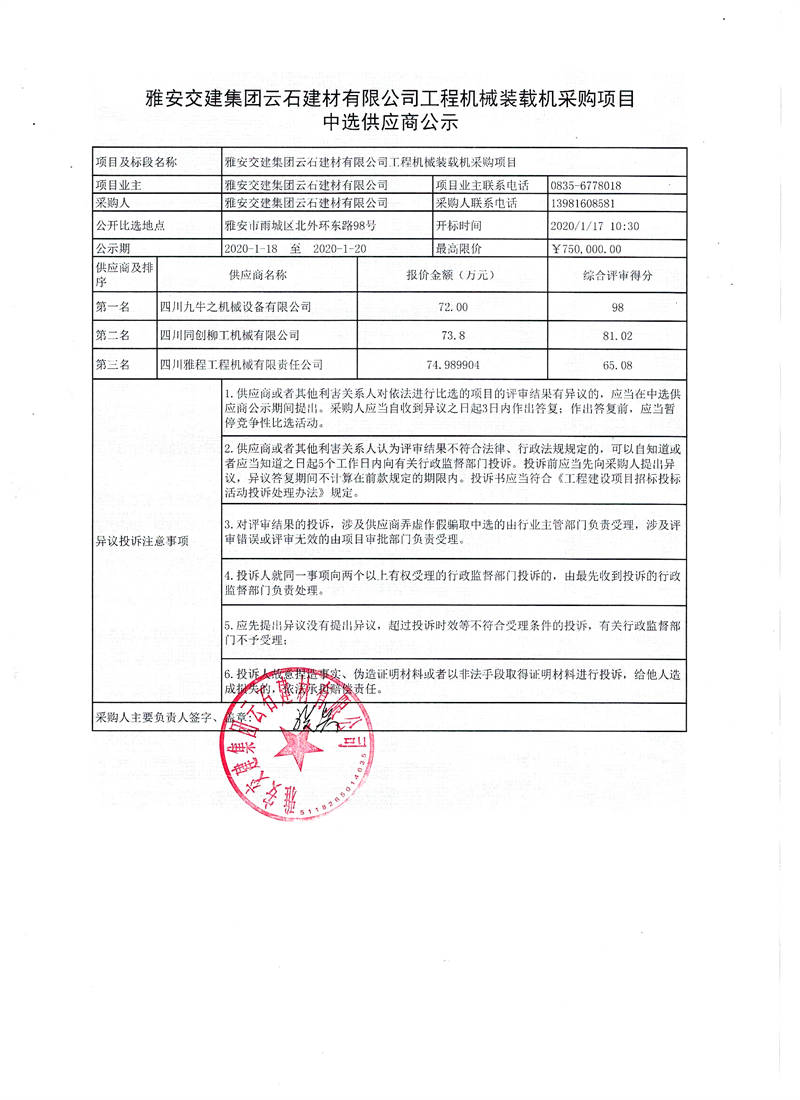 雅安交建集團云石建材有限公司工程機械裝載機采購項目中選供應(yīng)商公示