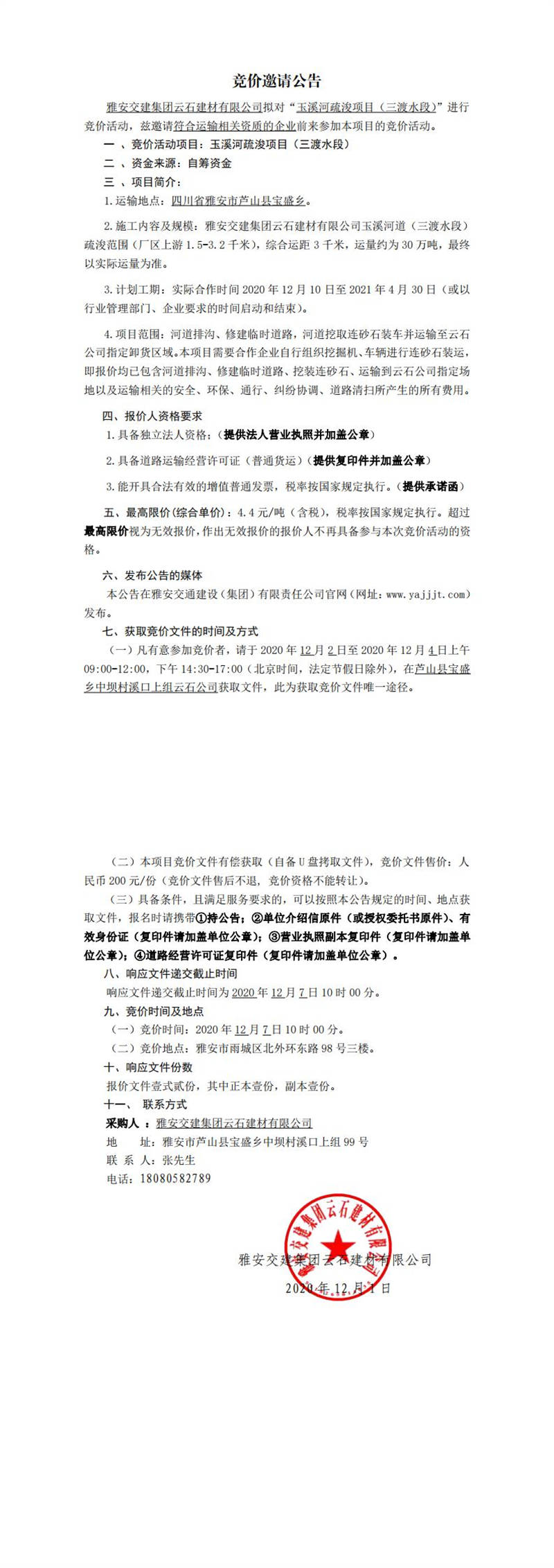 雅安交建集團云石建材有限公司玉溪河疏浚項目(三渡水段)競價公告