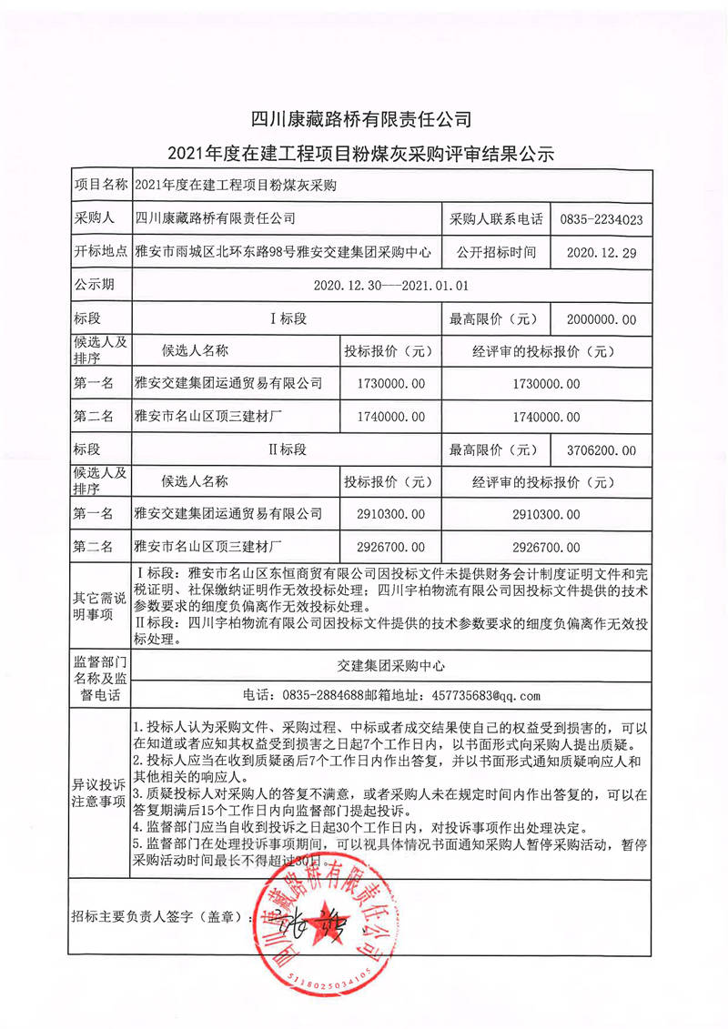 四川康藏路橋有限責(zé)任公司2021年度在建工程項(xiàng)目粉煤灰采購評(píng)審結(jié)果公示