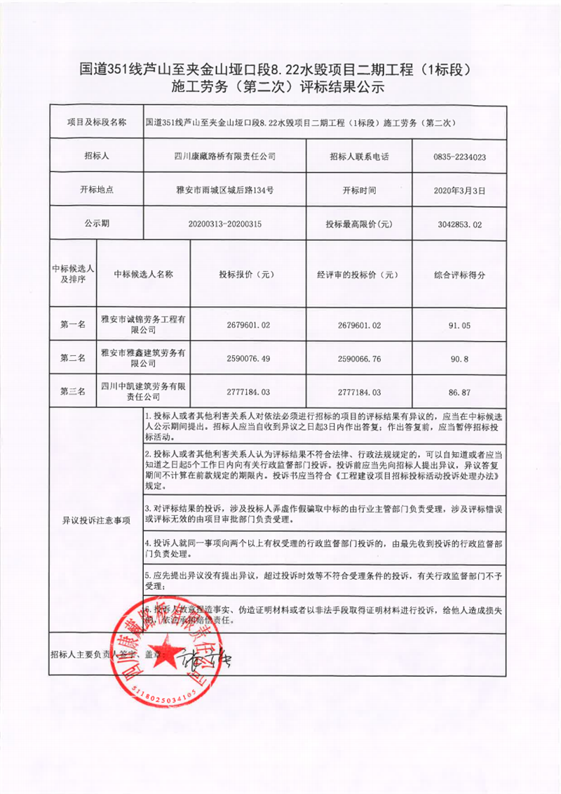 四川康藏路橋有限責(zé)任公司國(guó)道351線蘆山至夾金山埡口段8.22水毀項(xiàng)目二期工程(1標(biāo)段)施工勞務(wù)(第二次)評(píng)標(biāo)結(jié)果公示