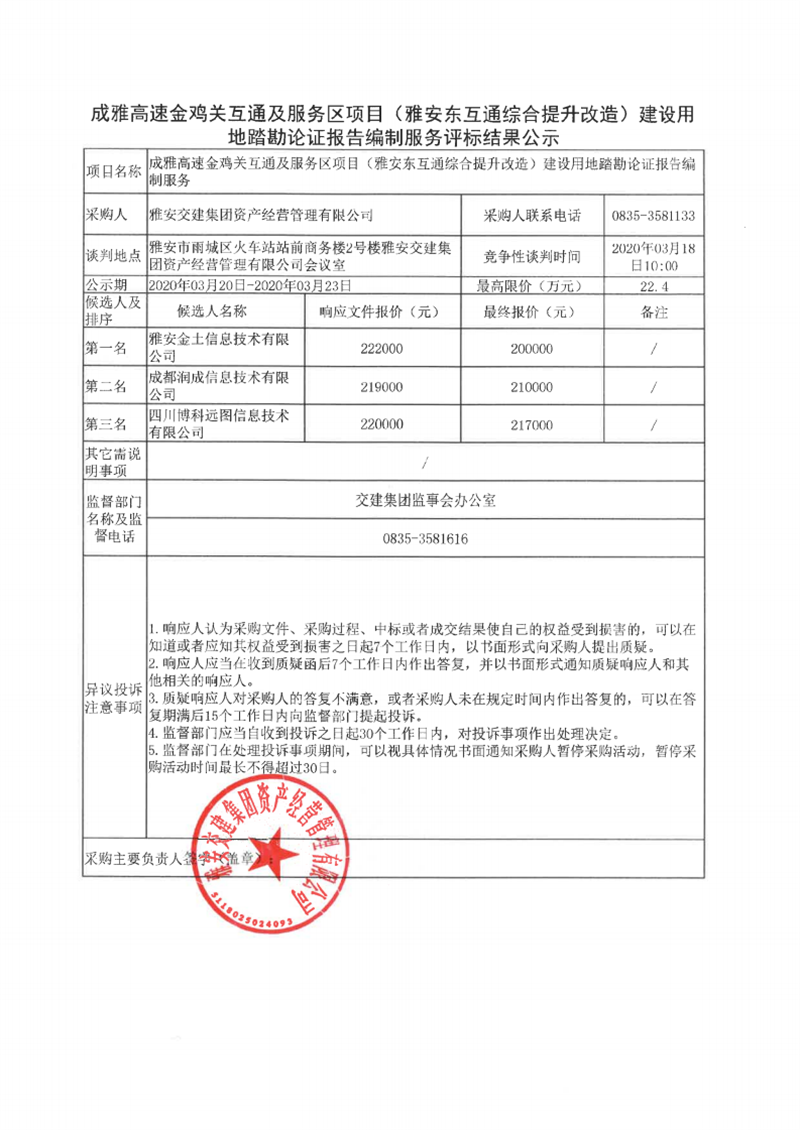 雅安交建集團(tuán)資產(chǎn)經(jīng)營(yíng)管理有限公司成雅高速金雞關(guān)互通及服務(wù)區(qū)項(xiàng)目(雅安東互通綜合提升改造)建設(shè)用地踏勘論證報(bào)告編制服務(wù)評(píng)標(biāo)結(jié)果公示