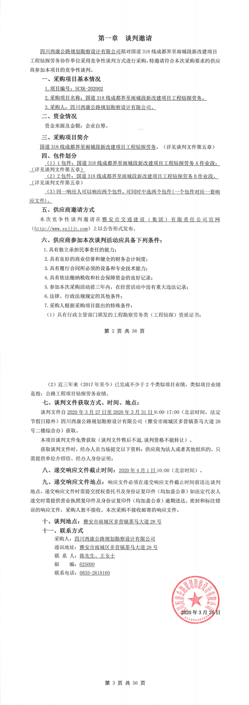 四川西康公路規(guī)劃勘察設計有限公司國道318線成都界至雨城段新改建項目工程鉆探勞務競爭性談判公告