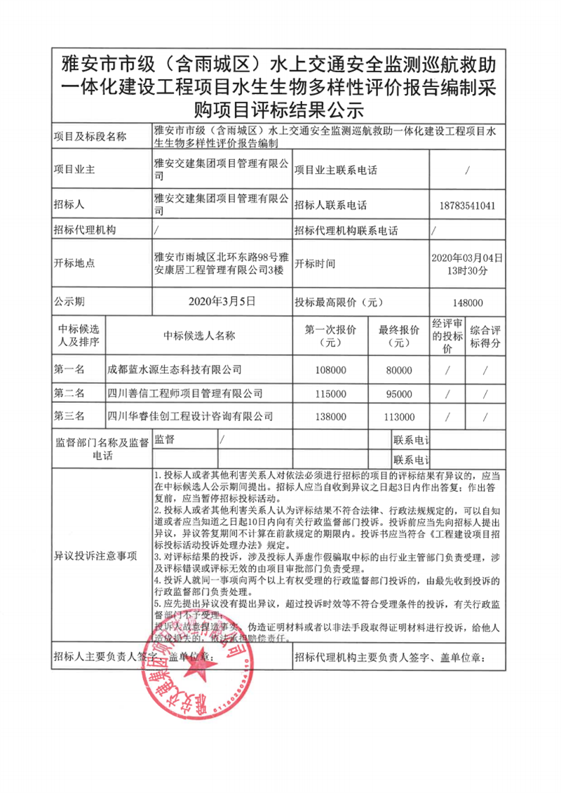 雅安交建集團(tuán)項(xiàng)目管理有限公司雅安市市級(jí)(含雨城區(qū))水上交通安全監(jiān)測(cè)巡航救助一體化建設(shè)工程項(xiàng)目水生生物多樣性評(píng)價(jià)報(bào)告編制采購(gòu)項(xiàng)目評(píng)標(biāo)結(jié)果公示