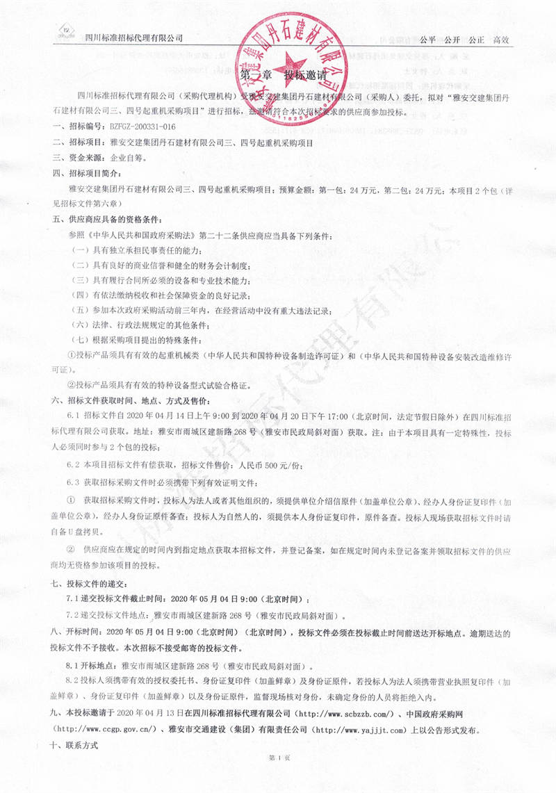 雅安交建集團(tuán)丹石建材有限公司三、四號(hào)起重機(jī)采購(gòu)項(xiàng)目招標(biāo)公告