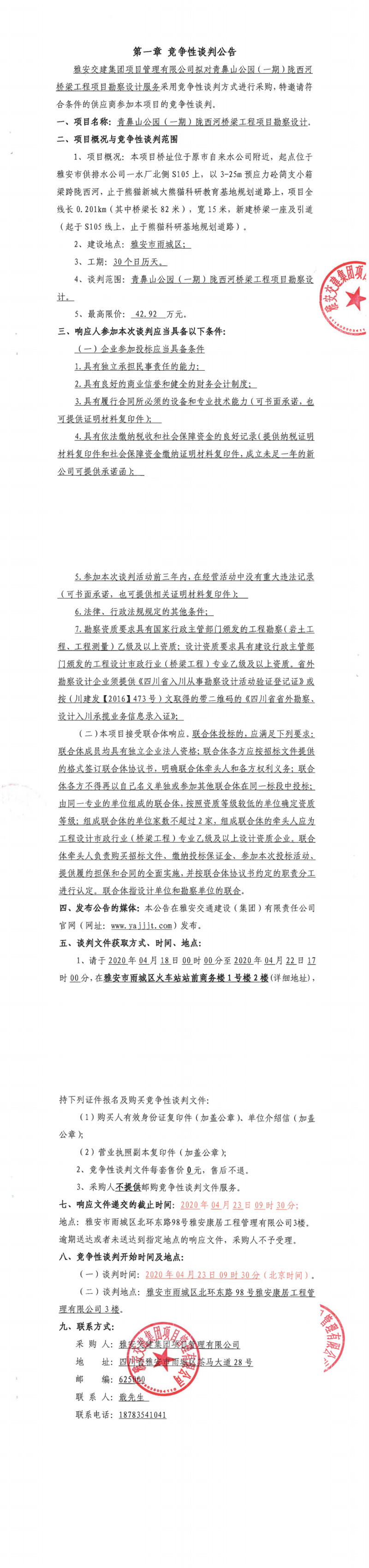 雅安交建集團(tuán)項目管理有限公司青鼻山公園(一期)隴西河橋梁工程項目勘察設(shè)計競爭性談判公告