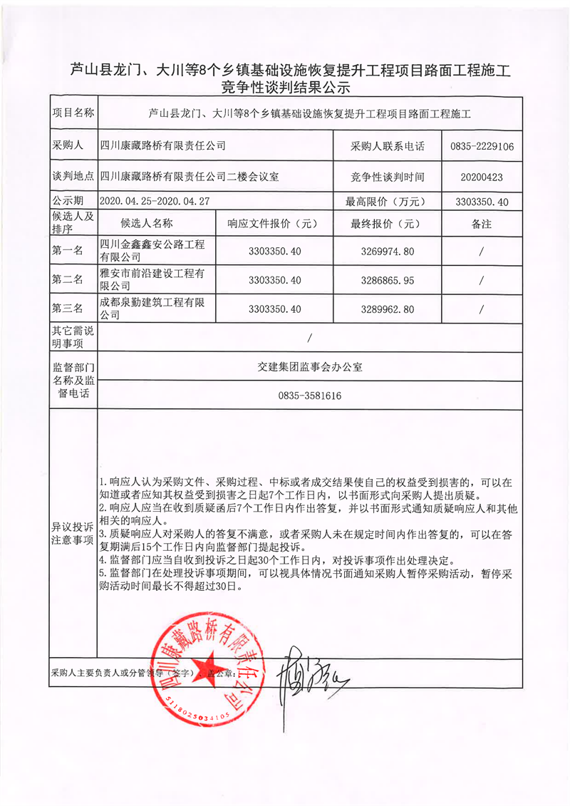 四川康藏路橋有限責任公司蘆山縣龍門、大川等8個鄉(xiāng)鎮(zhèn)基礎設施恢復提升工程項目路面工程施工競爭性談判結(jié)果公示