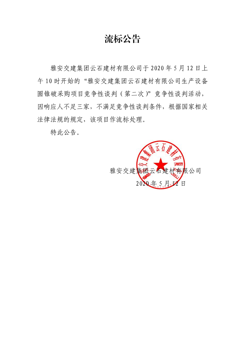 雅安交建集團云石建材有限公司生產(chǎn)設備圓錐破采購項目(第二次)流標公告
