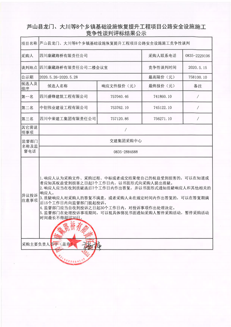 四川康藏路橋有限責(zé)任公司蘆山縣龍門、大川等8個(gè)鄉(xiāng)鎮(zhèn)基礎(chǔ)設(shè)施恢復(fù)提升工程項(xiàng)目公路安全設(shè)施施工競爭性談判評標(biāo)結(jié)果公示