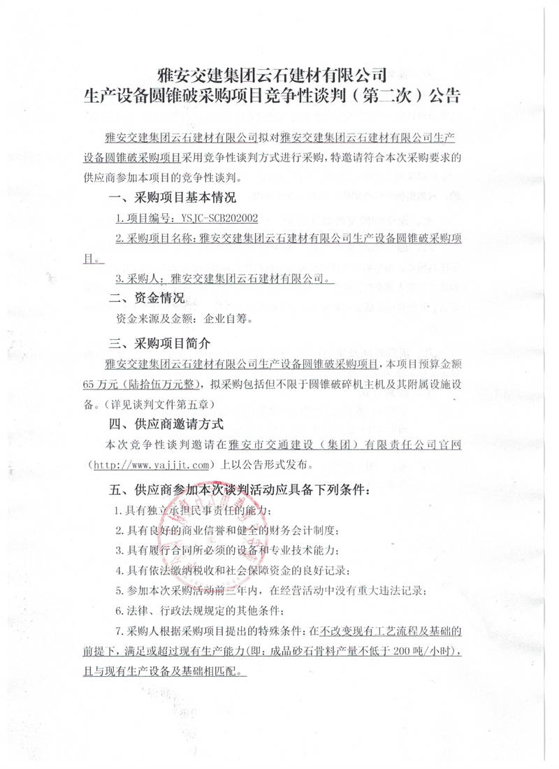 雅安交建集團(tuán)云石建材有限公司生產(chǎn)設(shè)備圓錐破采購項目競爭性談判(第二次)公告