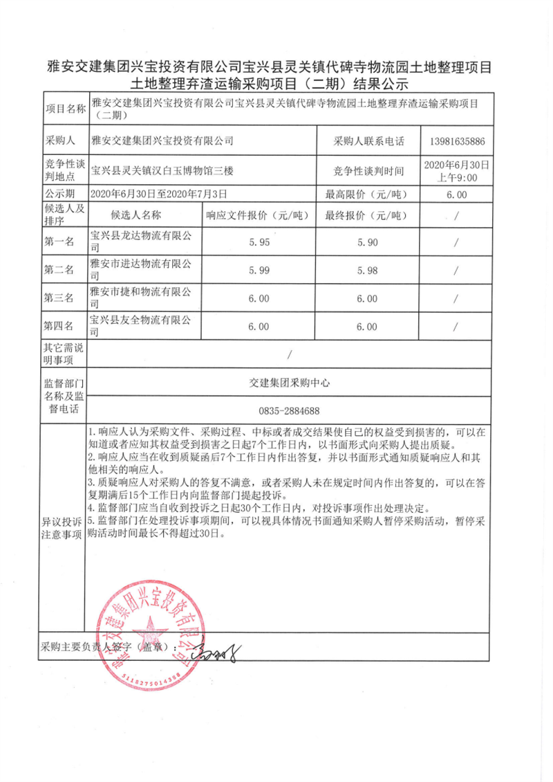 雅安交建集團(tuán)興寶投資有限公司寶興縣靈關(guān)鎮(zhèn)代碑寺物流園土地整理項目土地整理棄渣運輸采購項目(二期)結(jié)果公示