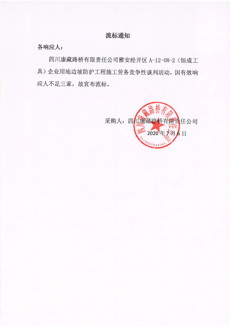 四川康藏路橋有限責(zé)任公司雅安經(jīng)開(kāi)區(qū)A-12-08-2(恒成工具)企業(yè)用地邊坡防護(hù)工程施工勞務(wù)流標(biāo)通知