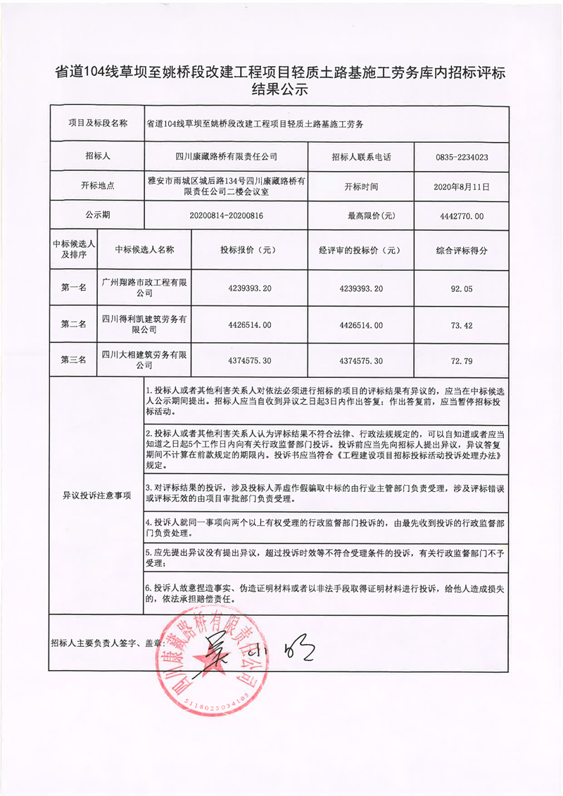 四川康藏路橋有限責任公司省道104線草壩至姚橋段改建工程項目輕質(zhì)土路基施工勞務庫內(nèi)招標評標結(jié)果公示