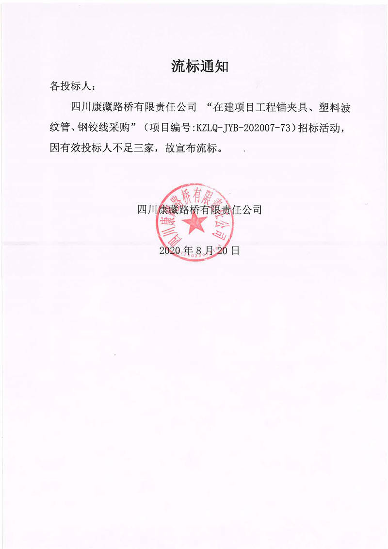 四川康藏路橋有限責(zé)任公司在建項目工程錨夾具、塑料波紋管、鋼鉸線采購流標(biāo)通知