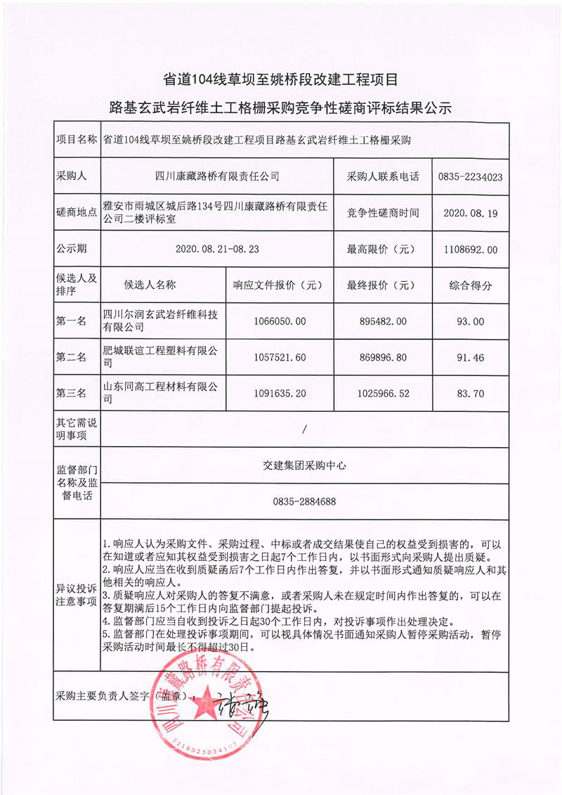 四川康藏路橋有限責任公司省道104線草壩至姚橋段改建工程項目路基玄武巖纖維土工格柵采購競爭性磋商評標結果公示