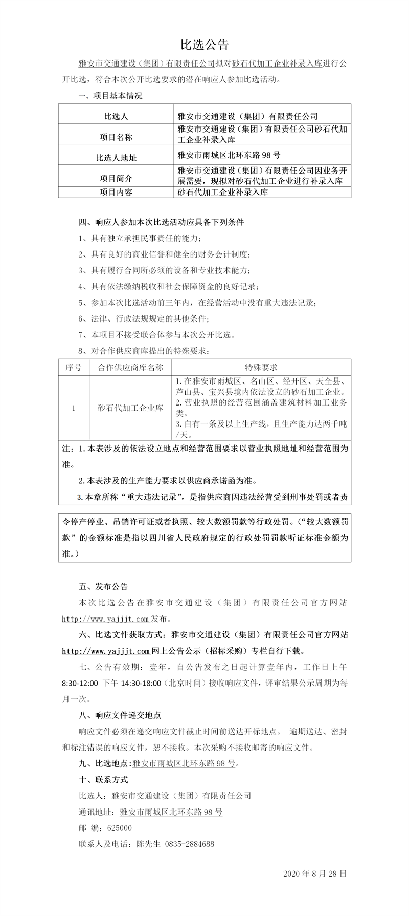 雅安市交通建設(集團)有限責任公司砂石代加工企業(yè)補錄入庫比選公告