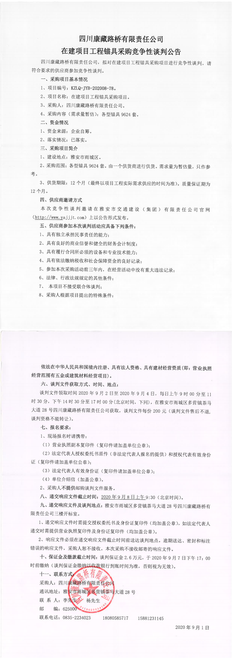 四川康藏路橋有限責(zé)任公司在建項(xiàng)目工程錨具采購(gòu)競(jìng)爭(zhēng)性談判公告