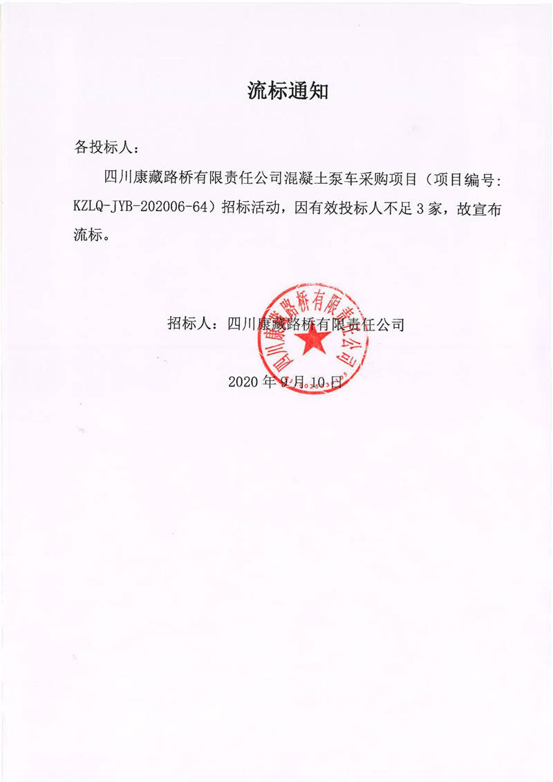 四川康藏路橋有限責(zé)任公司混凝土泵車(chē)采購(gòu)項(xiàng)目流標(biāo)通知