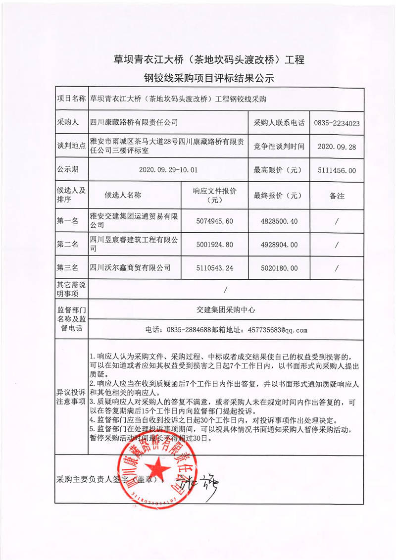 四川康藏路橋有限責(zé)任公司草壩青衣江大橋(茶地坎碼頭渡改橋)工程鋼鉸線采購項目評標(biāo)結(jié)果公示