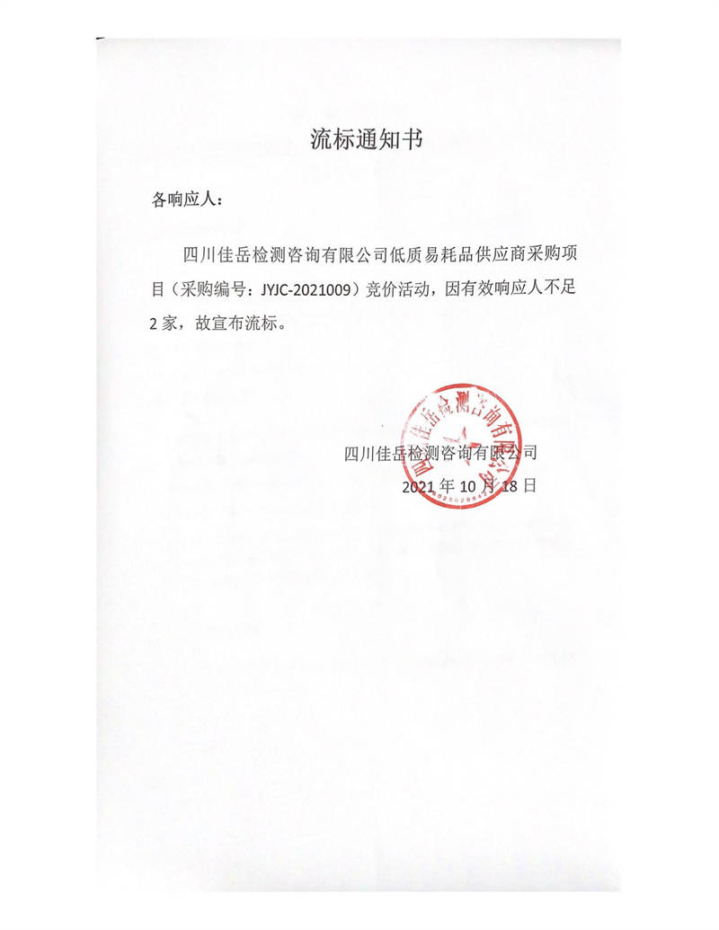 四川佳岳檢測咨詢有限公司低質(zhì)易耗品供應(yīng)商采購項目流標(biāo)通知