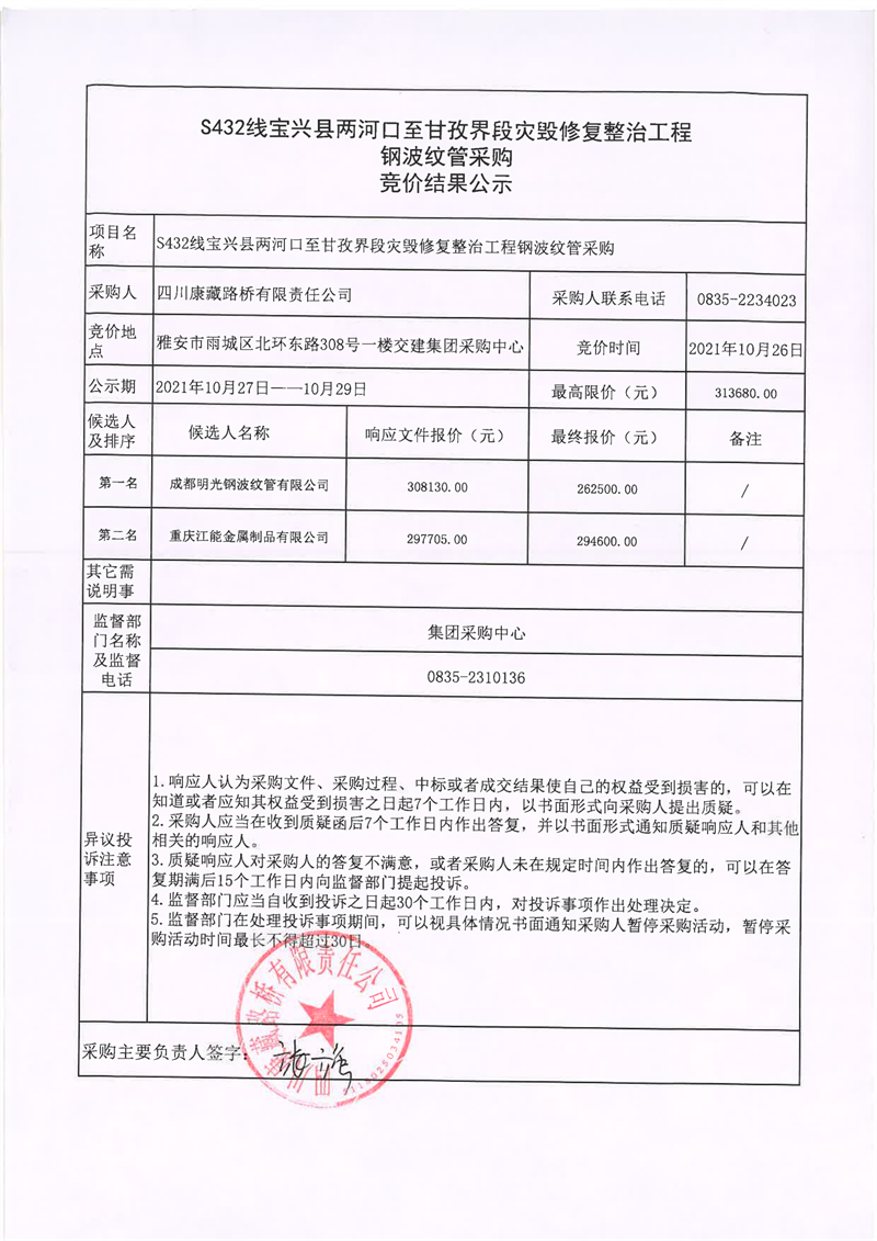 四川康藏路橋有限責(zé)任公司S432線寶興縣兩河口至甘孜界段災(zāi)毀修復(fù)整治工程鋼波紋管采購競價結(jié)果公示