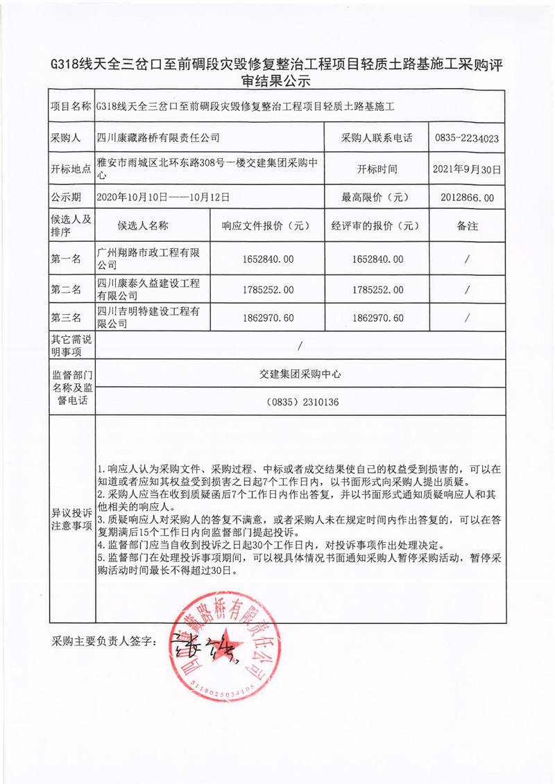 四川康藏路橋有限責(zé)任公司G318線天全三岔口至前碉段災(zāi)毀修復(fù)整治工程項目輕質(zhì)土路基施工采購評審結(jié)果公示