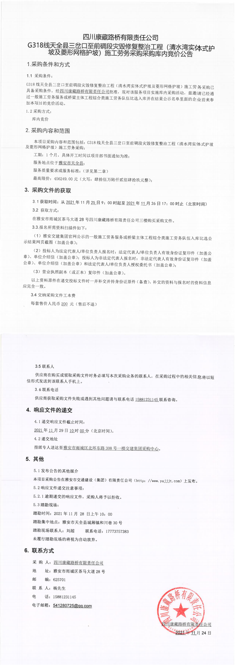 四川康藏路橋有限責任公司G318線天全縣三岔口至前碉段災毀修復整治工程(清水灣實體式護坡及菱形網(wǎng)格護坡)施工勞務采購采購庫內(nèi)競價公告