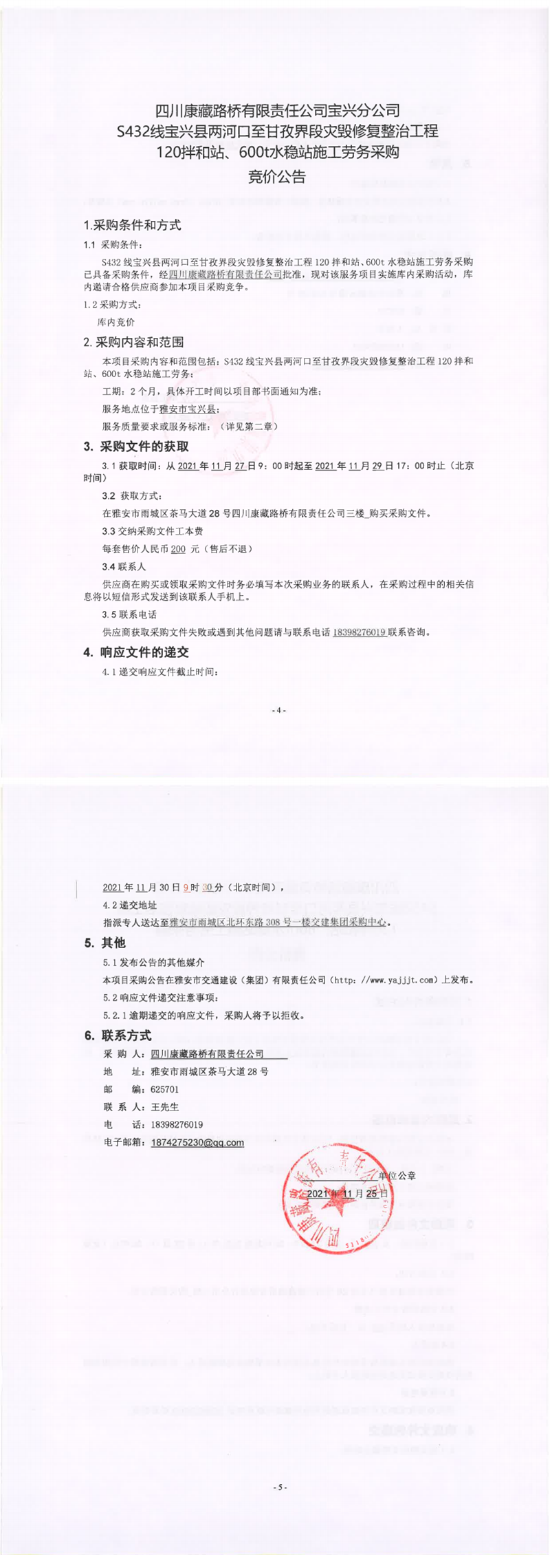 四川康藏路橋有限責(zé)任公司S432線寶興縣兩河口至甘孜界段災(zāi)毀修復(fù)整治工程120拌合站、600t水穩(wěn)站施工勞務(wù)采購(gòu)競(jìng)價(jià)公告