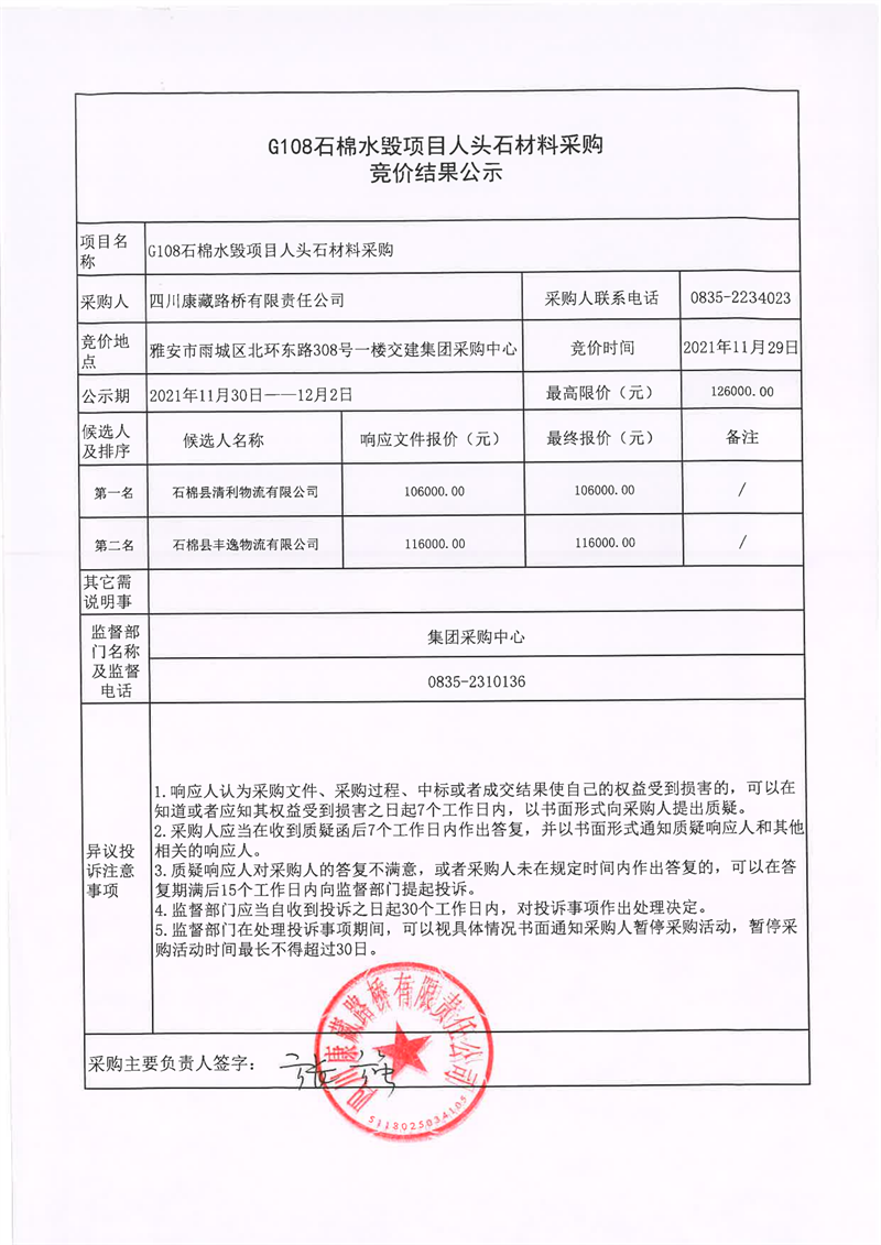 四川康藏路橋有限責(zé)任公司G108石棉水毀項(xiàng)目人頭石材料采購競價(jià)結(jié)果公示