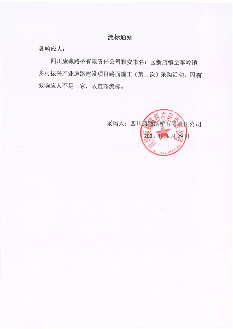 四川康藏路橋有限責(zé)任公司雅安市名山區(qū)新店鎮(zhèn)至車嶺鎮(zhèn)鄉(xiāng)村振興產(chǎn)業(yè)道路建設(shè)項(xiàng)目路面施工(第二次)流標(biāo)通知