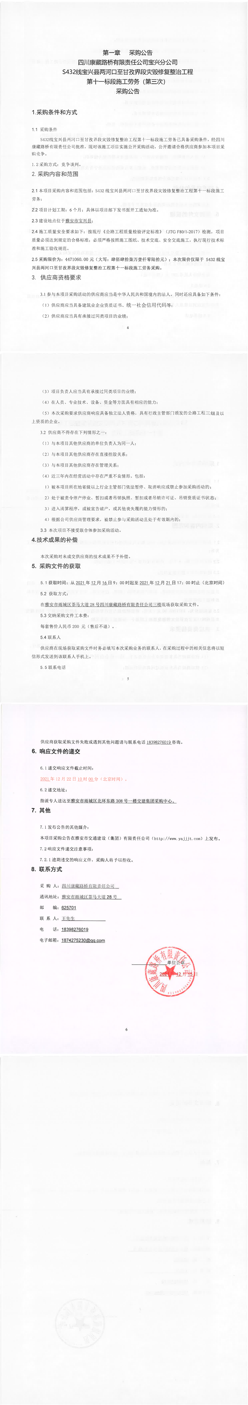 四川康藏路橋有限責(zé)任公司寶興分公司S432線寶興縣兩河口至甘孜界段災(zāi)毀修復(fù)整治工程第十一標(biāo)段施工勞務(wù)(第三次)采購(gòu)公告