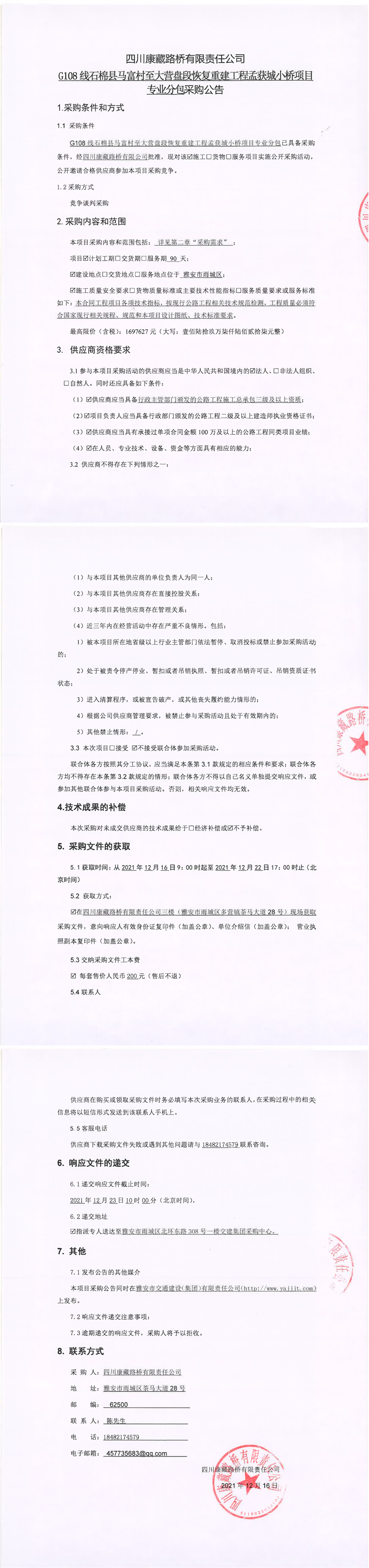 四川康藏路橋有限責(zé)任公司G108線石棉縣馬富村至大營(yíng)盤段恢復(fù)重建工程孟獲城小橋項(xiàng)目專業(yè)分包采購公告