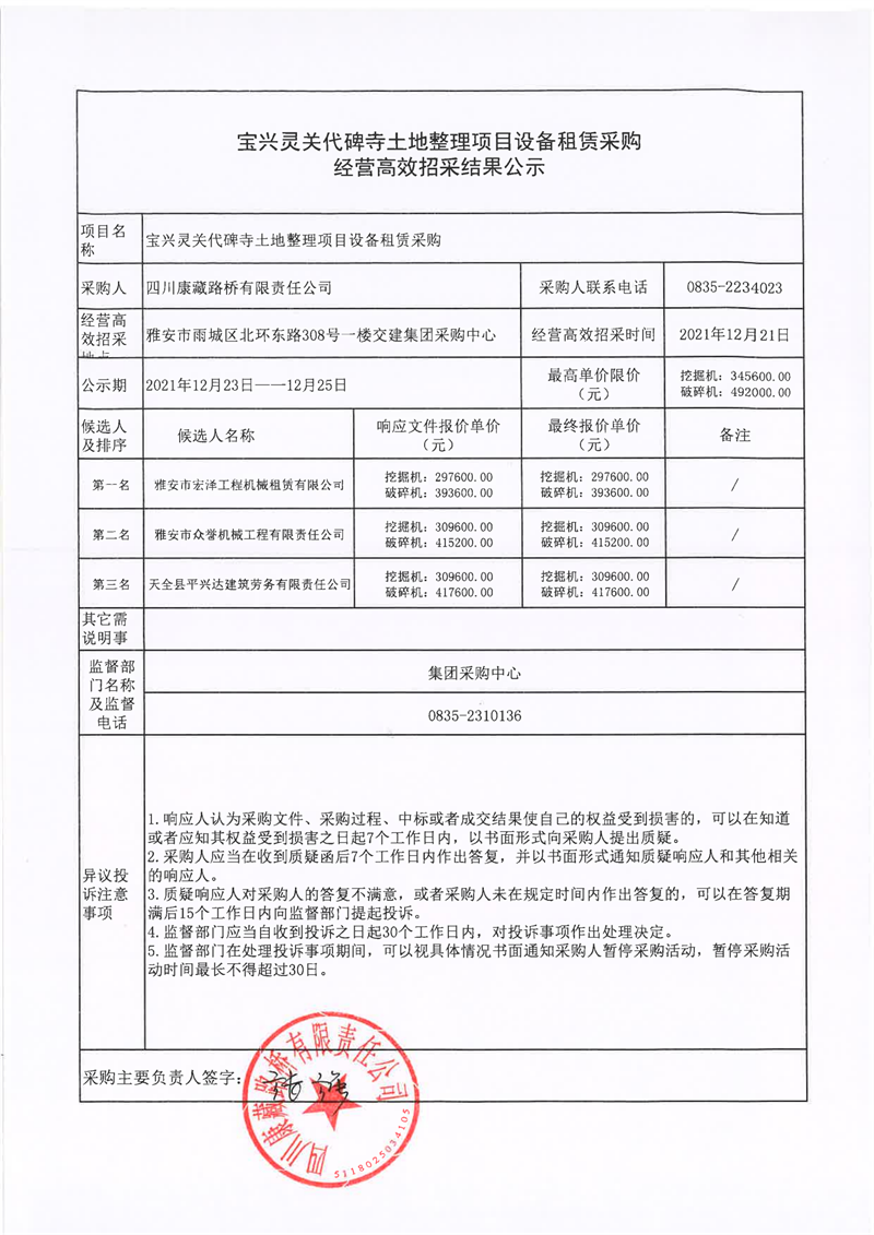四川康藏路橋有限責(zé)任公司寶興靈關(guān)代碑寺土地整理項(xiàng)目設(shè)備租賃采購經(jīng)營(yíng)高效招采結(jié)果公示