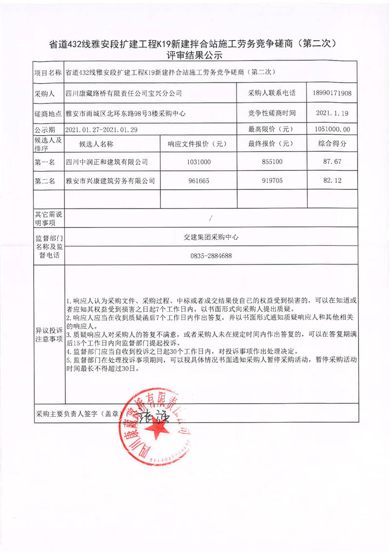 四川康藏路橋有限責任公司寶興分公司省道432線雅安段擴建工程K19新建拌合站施工勞務(wù)競爭磋商(第二次)評審結(jié)果公示