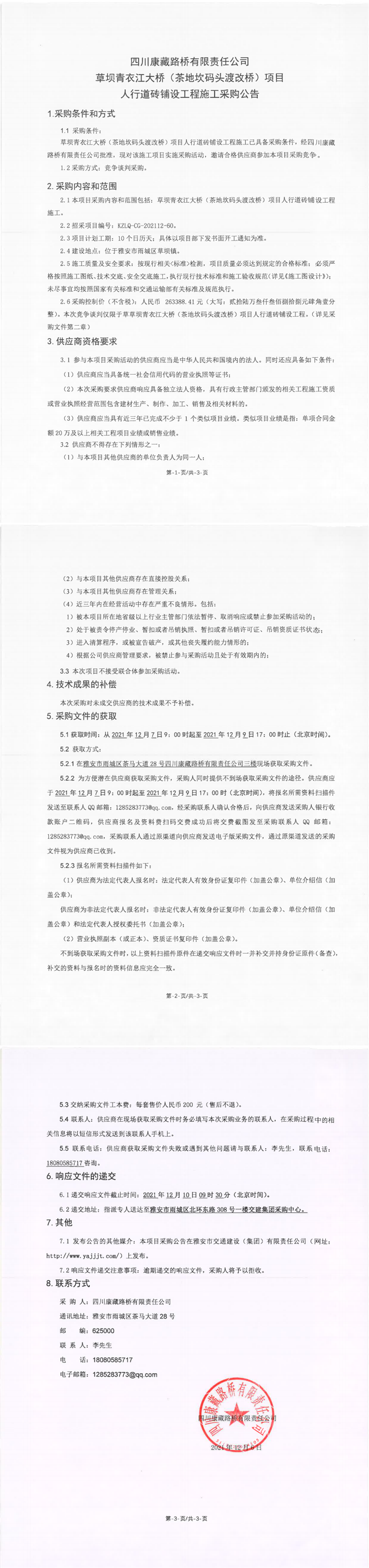 四川康藏路橋有限責(zé)任公司草壩青衣江大橋(茶地坎碼頭渡改橋)項目人行道磚鋪設(shè)工程施工采購公告